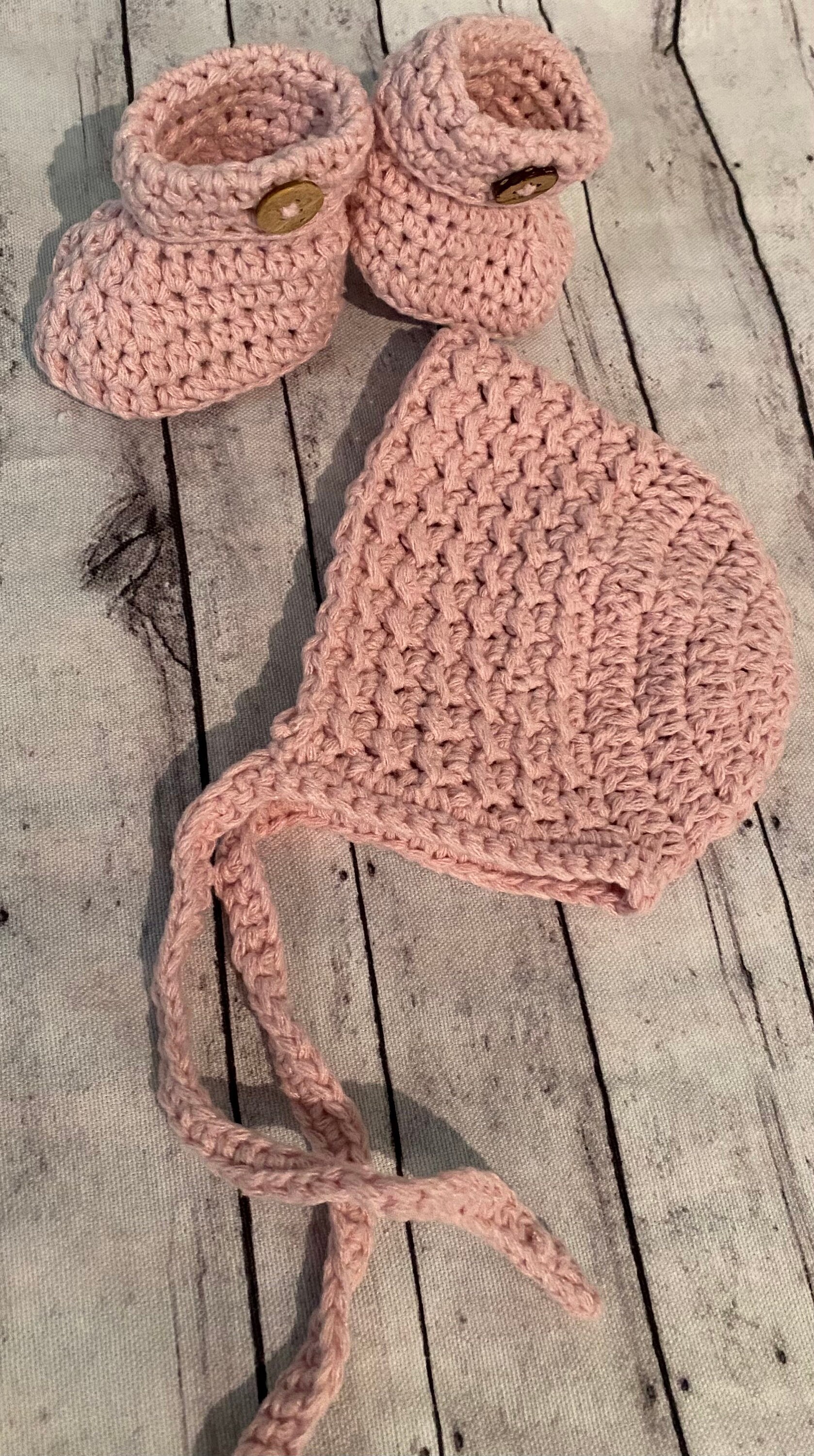 An adorable handmade keepsake baby bonnet set for your little one. Perfect for baby shower or photo op. Gender neutral colors as well as gender specific. Sizes up to toddler are available. Made with long ties to secure to baby’s head. Comes with matching booties.