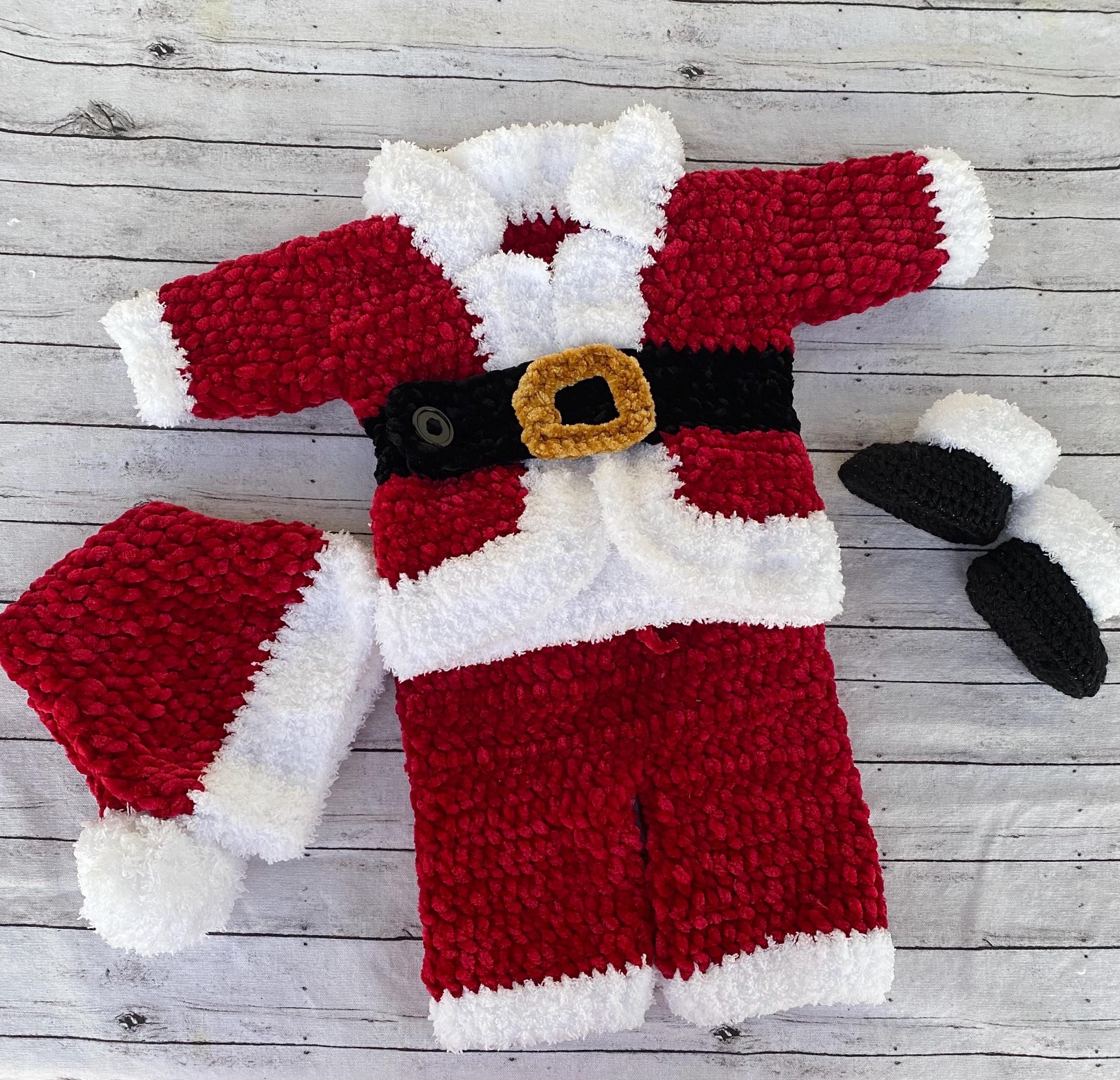 This is an adorable crocheted handmade Christmas Santa outfit made out of velvety yarn with fluffy trim. Dress up your little guy for the holidays.